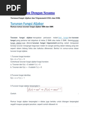 V (x), hasil pembagian fungsi , dan pangkat dari fungsi. Operasi hitung perkalian pecahan beserta rumus. Rumus cepat turunan akar guru ilmu sosial. Rumus rumus turu nan dengan menggunakan definisi turunan dapat diturunkan sejumlah rumus tentang turunan yaitu. Turunan fungsi eksponensial agak sedikit berbeda dengan turunan fungsi aljabar dan turunan fungsi trigonometri.